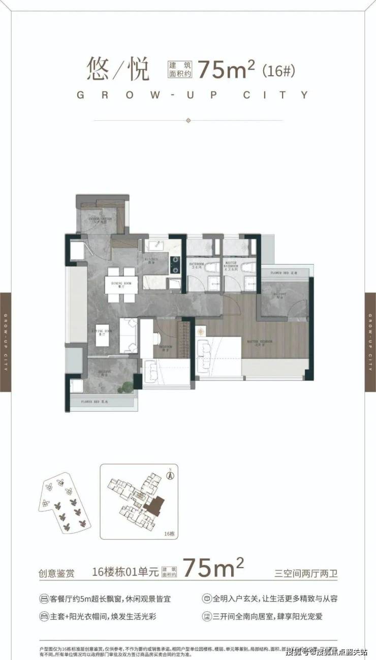 一期现有少量现楼尾货持续在售,现房实景可实地参观,户型、采光、楼间距、园林实景一目了然,买房看得见摸得着,规避期房交付不确定性。其中 75㎡三房两卫户型,是年轻刚需上车的热门选择,四开间朝南布局,全明通透格局,搭配转角玄关设计,收纳空间充足;开放式厨房衔接景观阳台,空间通透开阔;主卧配备独立卫浴与专属衣帽间,南北对流设计,小户型也能保证居住舒适度与私密性,低门槛轻松入主番禺主城区。