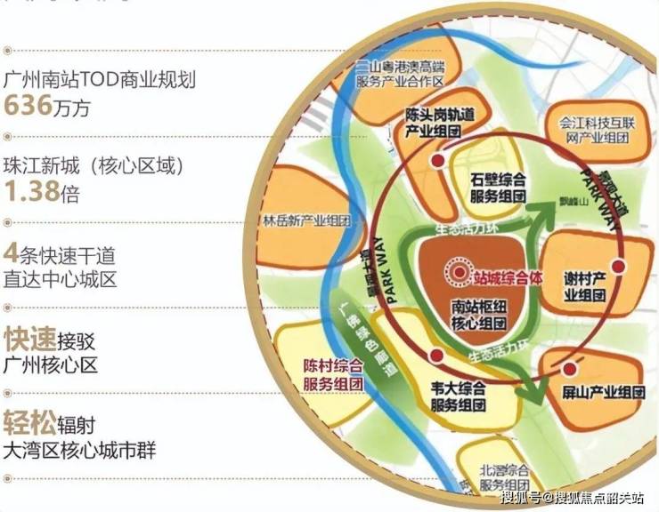 经济枢纽:根据《广州南站控制性规划》,广州南站商务区规划建筑面积达636万平方米,超过了珠江新城的核心商业面积,并计划建设4条直达市中心的快速干道,使南站到市中心只需10至20分钟车程。这将推动南站成为广州继老城区和珠江新城之后的第三增长极。
