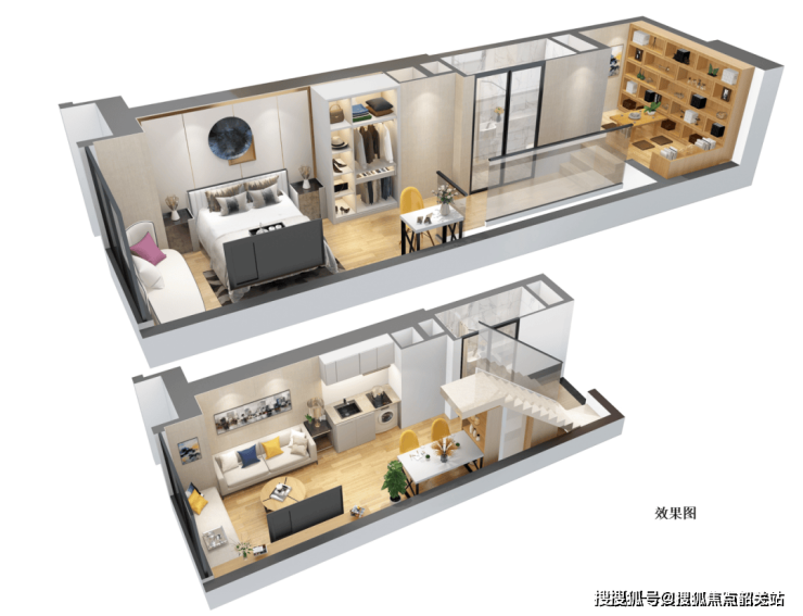 主推建面约31-74㎡LOFT商办单位,采用4.5米层高复式设计,使用率达100%。其中: