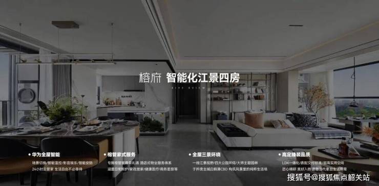 同时配置了华为的全屋智能系统,具备稳定可靠的 PLC 全屋网络,高速覆盖的全屋 WiFi,支持丰富的可扩展的鸿蒙生态配套,业主可以远程控制家里的家电,比如空调、灯光、窗帘,还可以设置不同的场景模式,比如回家模式、离家模式、观影模式,所有的鸿蒙设备都可以互联互通,为业主带来智能的居住体验,以 “恒温、恒湿、恒氧” 等高标准的智能体系,为业主提供健康舒适的全龄段宜居生活。