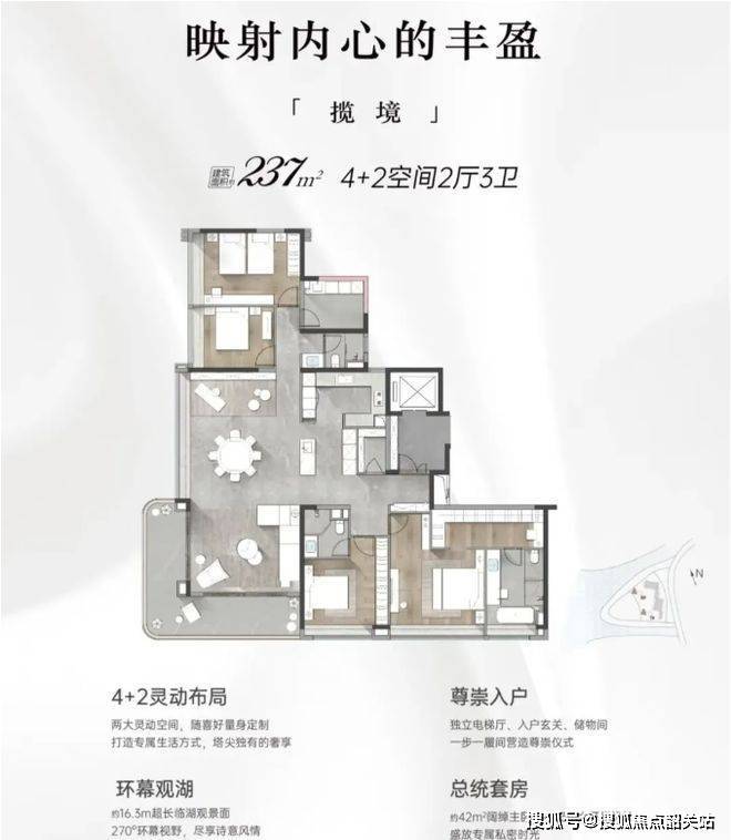 户型设计尽显高端品质,得房率 93% 。两梯两户,专梯入户,私密性好。180 - 237 平大平层,空间宽敞,LDKG 一体化设计,237 ㎡户型 270° 巨幕阳台,采光和视野极佳。每个户型都充分考虑居住舒适性和空间利用,满足改善型家庭对高品质生活的追求。