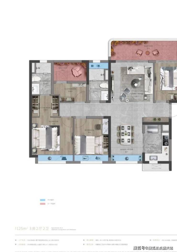120-125㎡三房两厅两卫:舒适刚需户型,在105㎡户型基础上优化空间布局,客厅与餐厅通透相连,空间更显宽敞;阳台尺寸升级,观景视野更佳,可满足业主晾晒、休闲等多重需求;卧室空间适度扩大,居住舒适度提升,其中主卧配备步入式衣帽间与独立卫浴,彰显品质感;厨房与餐厅相邻,方便上菜与清洁,适合对居住空间有更高要求的刚需家庭。
