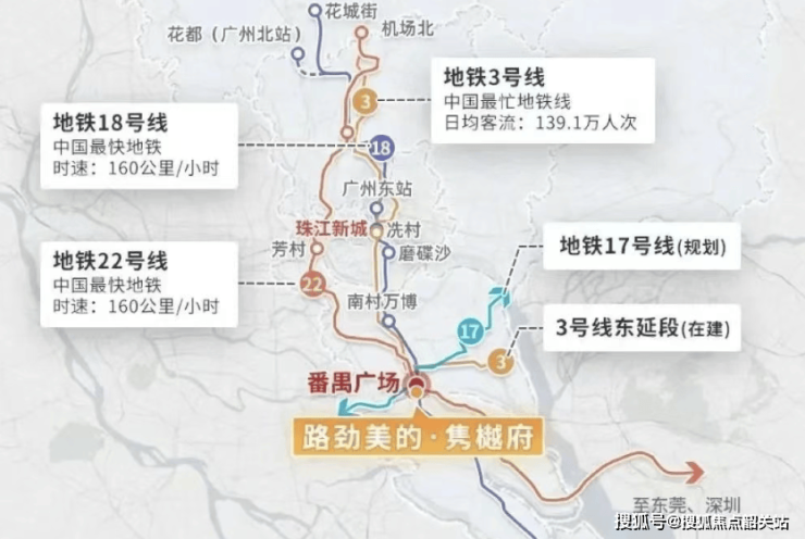 路劲美的·隽樾府所在的番禺区府板块利好密集兑现,成为入住核心区的黄金时机。交通方面,地铁3号线、18号线、22号线已通车,规划中的17号线即将落地,四地铁交汇格局成型,1站直达珠江新城、琶洲,通勤效率大幅提升;番禺广场TOD规划加速推进,85万方超级枢纽将打造“地下商业+中央公园”模式,260米地标建筑将重塑城市天际线。