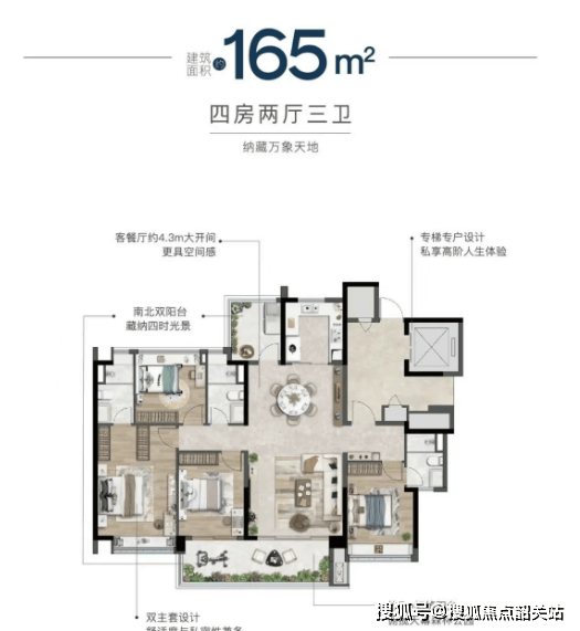 建面168平方米四房:专梯专户设计,客厅开间4.3米,7米长景观大阳台,适合追求高品质生活的家庭。