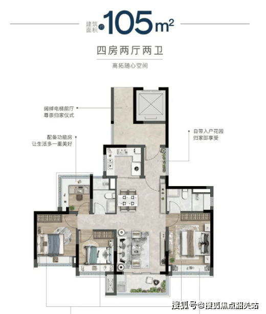 建面104-106平方米四房两卫:四开间朝南,采光良好,配备独立入户花园。