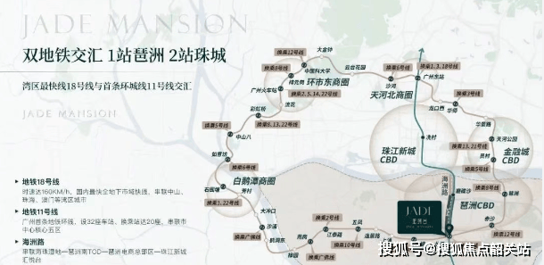 珑璟台作为TOD项目,依托地铁18号线和11号线(环线)双轨交汇枢纽,能够快捷地到达琶洲、珠江新城、国际金融城三大核心CBD。地铁18号线是国内最快的全地下市域快线之一,串联中山、珠海、澳门等湾区城市;而地铁11号线则是广州首条地铁环线,换乘便捷。