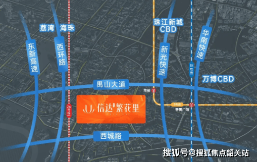 项目临近两大城市主干道——禺山大道和西环路,接驳东新高速可达荔湾和海珠区,接驳新光快速通达万博及珠江新城CBD,交通高效便捷。自驾或乘坐公共交通均可快速到达广州主要核心商圈及行政中心,为工作及生活提供极大便利。毗邻地铁与快速路网的双重交通优势,使信达·繁花里在市桥老城中心区极具吸引力,兼顾居住舒适性和出行效率。