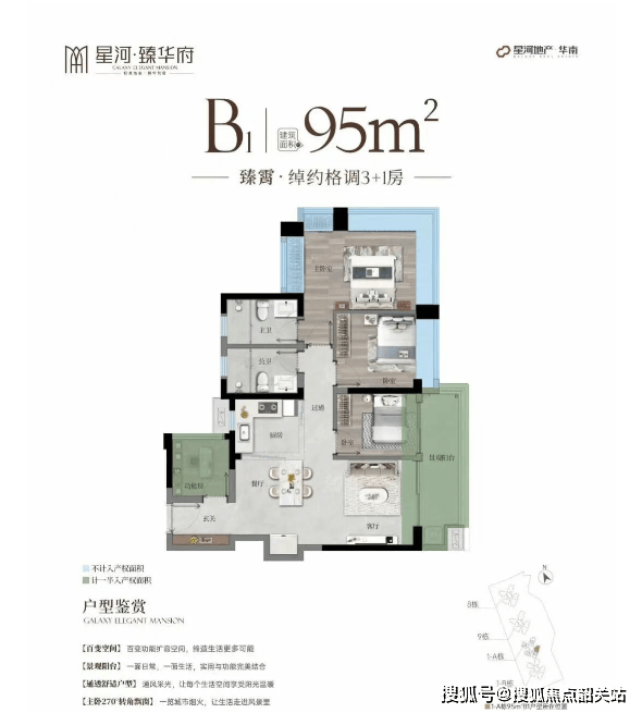 户型设计全面响应新规优化方向,主打85–125㎡三至四房,最大亮点为“全南向”——所有户型客厅与主卧均朝南,确保全天候采光与通风,彻底解决传统塔楼“选边难”痛点。得益于新规阳台与结构优化,使用率接近100%,85㎡即可实现三房两卫,125㎡做到四房双卫+多功能空间,空间布局紧凑高效。外立面采用大面玻璃窗、香槟色金属线脚与真石漆组合,呈现现代轻奢质感。尽管容积率较高、地铁距离稍远,且学校尚在建设中,但凭借“全南向+近100%使用率+双山环抱+科学城产业支撑”的综合优势,星河·臻华府在黄埔刚需及首改市场中展现出极强的产品力与长期居住价值。