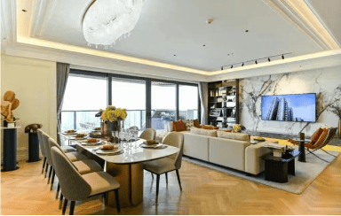 建面约 245-247㎡五房两厅三卫:塔尖终极之选,瞰湖大平层采用独享专梯入户设计,保障私密性与尊崇感;约 8.1 米开间客厅 + 3.3 米层高,空间开阔无压抑,约 11 米长奢阔阳台 + 270° 弧形观景视野,将花都湖全景引入室内,推窗即见湖景;双主卧豪华套房设计,均配备独立卫浴与超大观景飘窗,满足多代同堂高端需求;全屋收纳系统完善(如玄关柜、步入式衣帽间),高实用率(约 90%)与湖景资源结合,居住体验媲美湖景别墅,是花都滨水新城 “塔尖湖居” 的代表户型,兼具居住与收藏价值。
