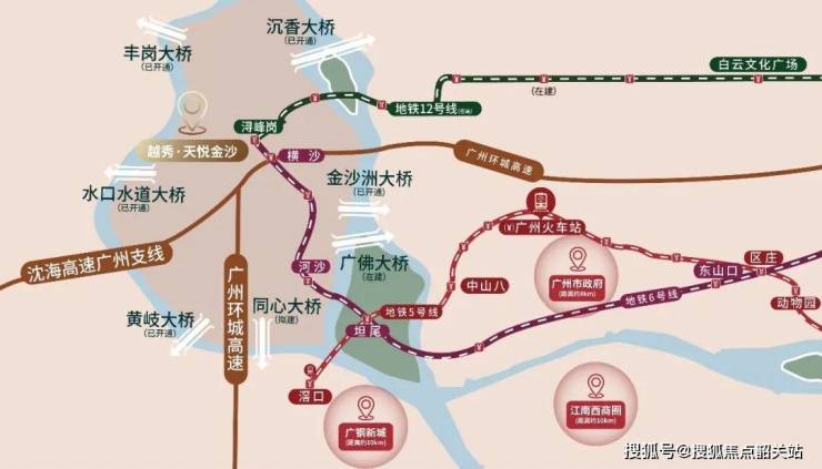 越秀天悦金沙坐落于广州市白云区金沙洲浔峰山东路金沙铭峰一街 1 号 。其地理位置得天独厚,紧邻 6 号线浔峰岗站,为居民的日常出行提供了极大便利。对于依赖公共交通出行的居民而言,步行较短距离即可抵达地铁站,轻松畅达广州各处。除了地铁,项目周边的公交线路也十分丰富,多条公交线路在附近设有站点,进一步织密了交通网络,为居民提供了多元化的出行选择。