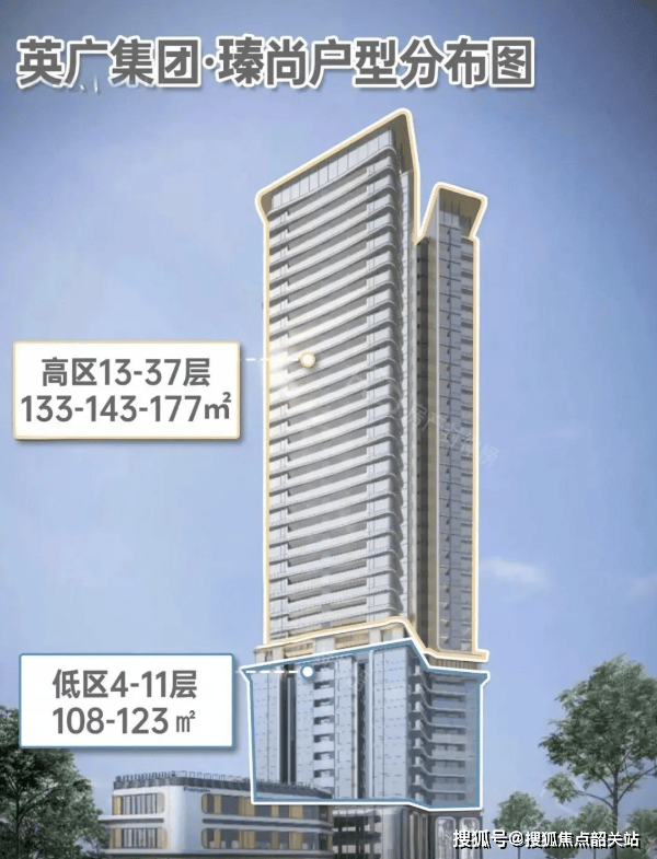 瑧尚延续英广对“小而精、高定感”地块的极致打磨能力。项目总建筑面积约5.3万㎡,仅规划208套住宅,稀缺性不言而喻。建筑采用高低区分区设计:低区(4-11层)主打建面约108-123㎡三至四房,精准匹配刚需改善需求;高区(13-37层)则聚焦建面约133-177㎡阔绰四房,专为高端改善客群量身定制。