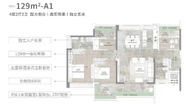 129平方米户型:客厅开间达到5米,餐客厅南北对流,8米L型阳台,兼具实用性和观赏性。