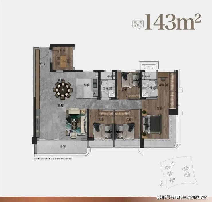 在售户型:建面约98-143㎡三至四房(精装交付),其中125㎡户型占比60%,南北通透,主卧套房设计。
