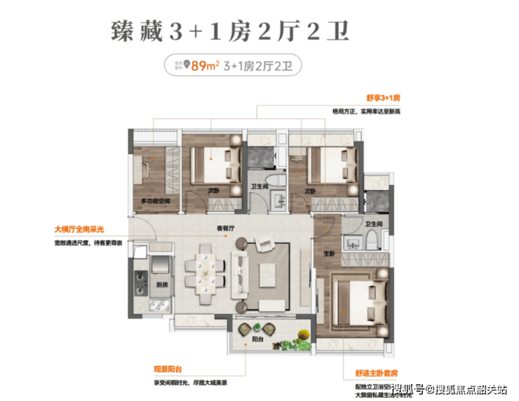 改善型五房,适配三胎家庭或三代同堂大家庭,极致空间利用,五房设计无浪费。客厅连接超大观景阳台,俯瞰园林与大城景观;主卧带独立卫生间 + 飘窗,私密性与舒适度拉满;额外房间可作书房、储物间、娱乐室,功能灵活多变,比同户型产品省 200 万,性价比碾压同板块。