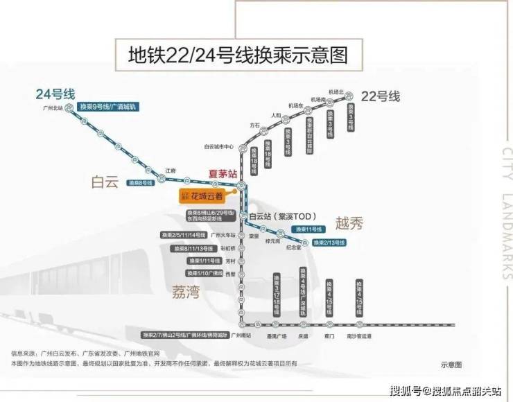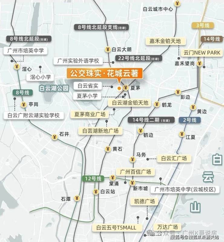 项目紧邻地铁 22 号线与 8 号线北延段支线交汇的夏茅站,步行仅约 20 米,真正地铁上盖物业。22 号线时速 160 公里,1 站直达白云新城、2 站到越秀、3 站至荔湾,换乘 18 号线 5 站直达珠江新城;8 号线北延段支线串联白云湖、同德围、花都,无缝衔接广州北站、棠溪 TOD,未来还规划 24 号线在此交汇,三地铁环绕,快速通达全城,主城通勤、跨区出行高效便捷。