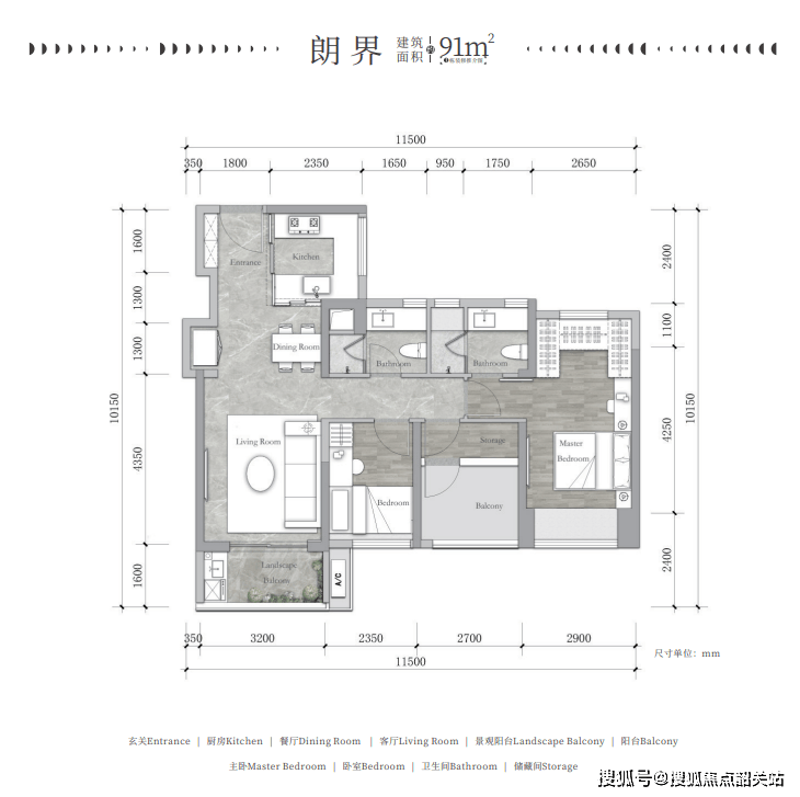 建面约91㎡ 2房2厅2卫+1灵动空间: