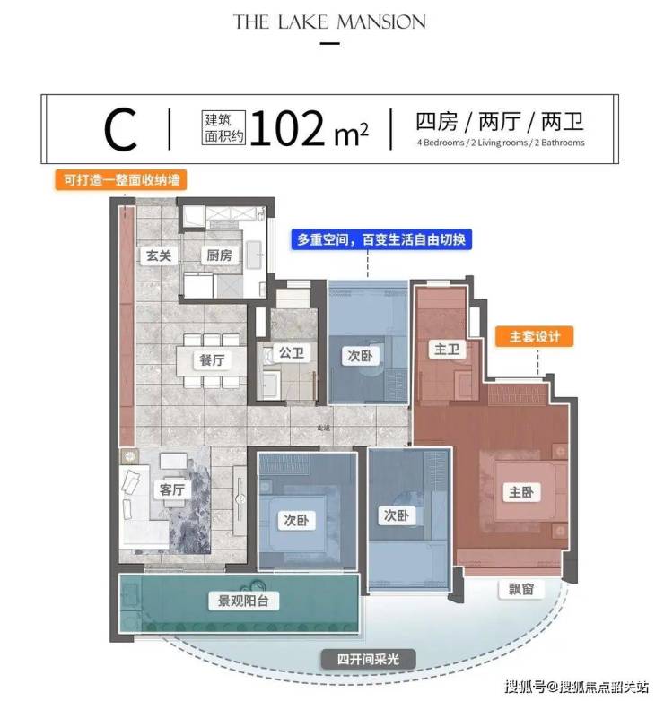 四开间大气格局,通透明朗,约6米长阳台,享受IMAX般的惬意景致。