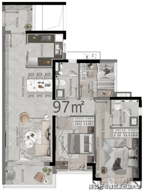 97㎡三房两厅两卫:总价约360-380万元,单价3.8万/㎡起。三房全南向,配备入户花园,灵活空间可改造为书房或儿童房,适合年轻家庭。