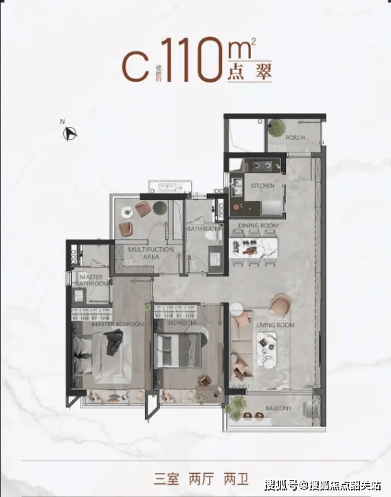 110㎡三房两厅两卫:总价约420-440万元。提供双阳台或入户花园两种布局,L型厨房动线流畅,动静分区明确。