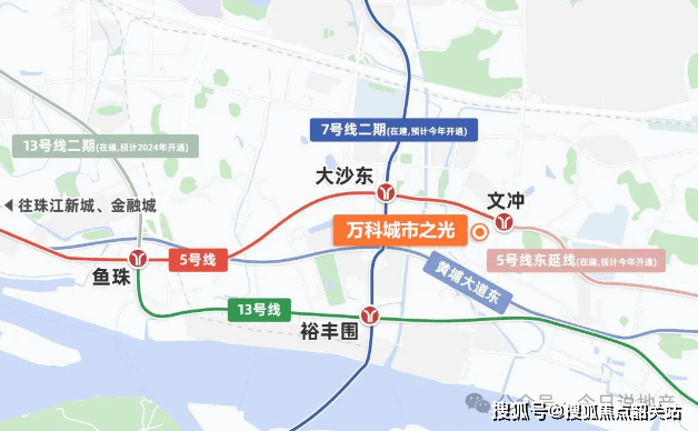 E、F区靠近5号线、7号线交汇的大沙东站,而目前在售的A区,则距离文冲站,最近只有约80米。5号线、7号线二期,都是含金量极高的地铁线。5号线自不用说,串联着金融城、珠江新城两大CBD。同时去年12月,7号线二期也已经开通。从项目出发,也可以一线直达科学城、大学城、万博CBD、广州南站等地。