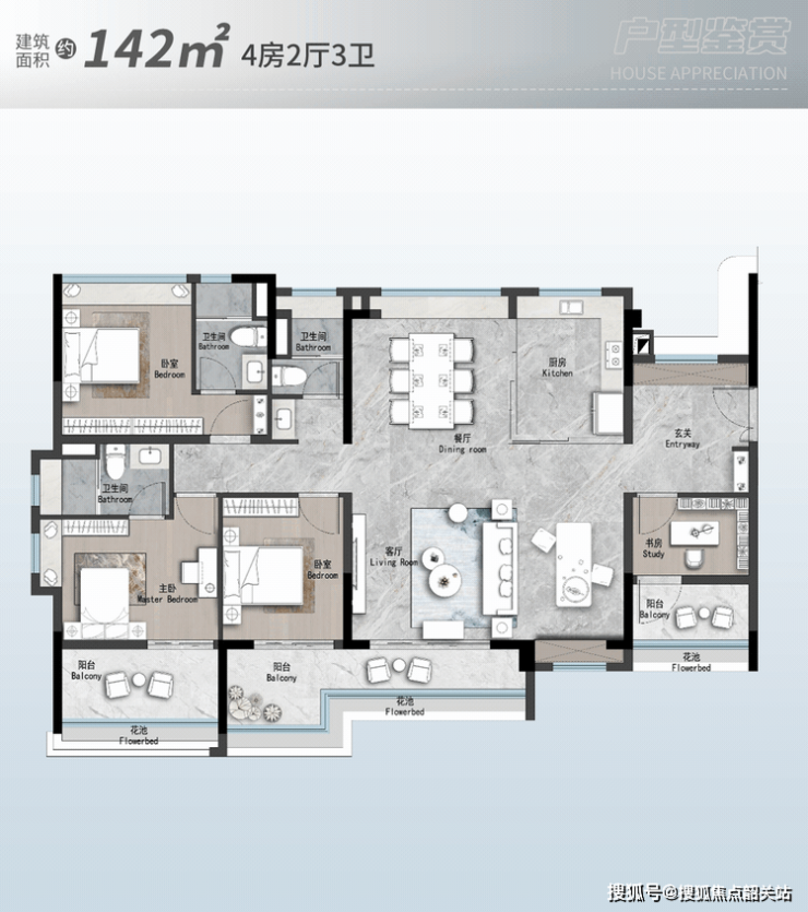 建面约123-143㎡四房户型,适配改善型家庭,布局灵动多变,能满足家庭成长需求。其中,建面约142㎡户型堪称经典,做到南北对流设计,空气流通性极佳,有效驱散广州夏季闷热;采用超大LDKB设计,将客厅、餐厅、厨房、阳台融为一体,空间开阔通透,无论是日常家庭聚会还是好友轰趴,都能轻松容纳;双套房设计,主卧与次卧均配备独立卫生间与衣帽间,兼顾家庭成员之间的隐私与便利,适合三代同堂或二胎家庭。