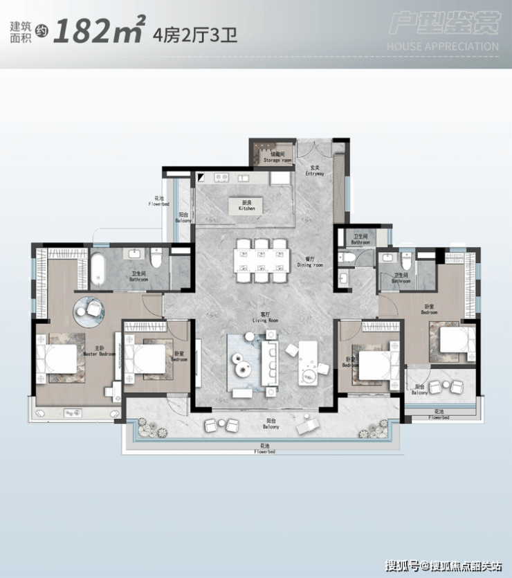 建面约182-185㎡四房大平层户型,面向终极改善需求,彰显圈层格调。户型空间开阔,尺度感十足,客厅面宽超6米,搭配全景落地窗,将园林景观与城市视野尽收眼底;主卧套房设计奢华舒适,配备独立卫浴、步入式衣帽间、观景飘窗,打造专属私密空间;预留多功能空间,可根据需求改造为书房、茶室、儿童游乐区等,满足个性化生活需求,搭配七恒气候系统,尽享高端人居体验。