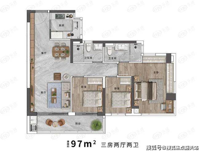 97㎡户型设计精巧,空间利用高效。四开间朝南的布局,使得阳光能够充分洒入室内,三个南向卧室保证了居住的舒适性和温暖感。长达约 6.3 米的阳台连通次卧,不仅增加了室内采光面,还拓展了生活空间,可作为休闲区,摆放桌椅,享受阳光与江景。主卧南北双面采光的设计独具匠心,进一步提升了居住的舒适度,让居住者无论白天黑夜都能感受到自然光线的魅力。整体户型动静分区合理,活动区与休息区互不干扰,为家庭生活营造出温馨舒适的氛围。