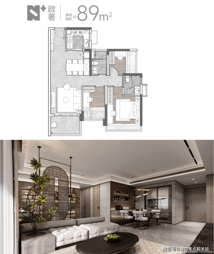 89㎡三厅两卫:入门级神户型,空间布局紧凑合理,同等面积多一功能间。LDKB互通设计,让阳光洒满每个角落。超大景观阳台,视野开阔。主卧带飘窗,采光充足。U型餐厨空间流畅宽敞,满足家庭烹饪需求。南北通透,清风婉转。