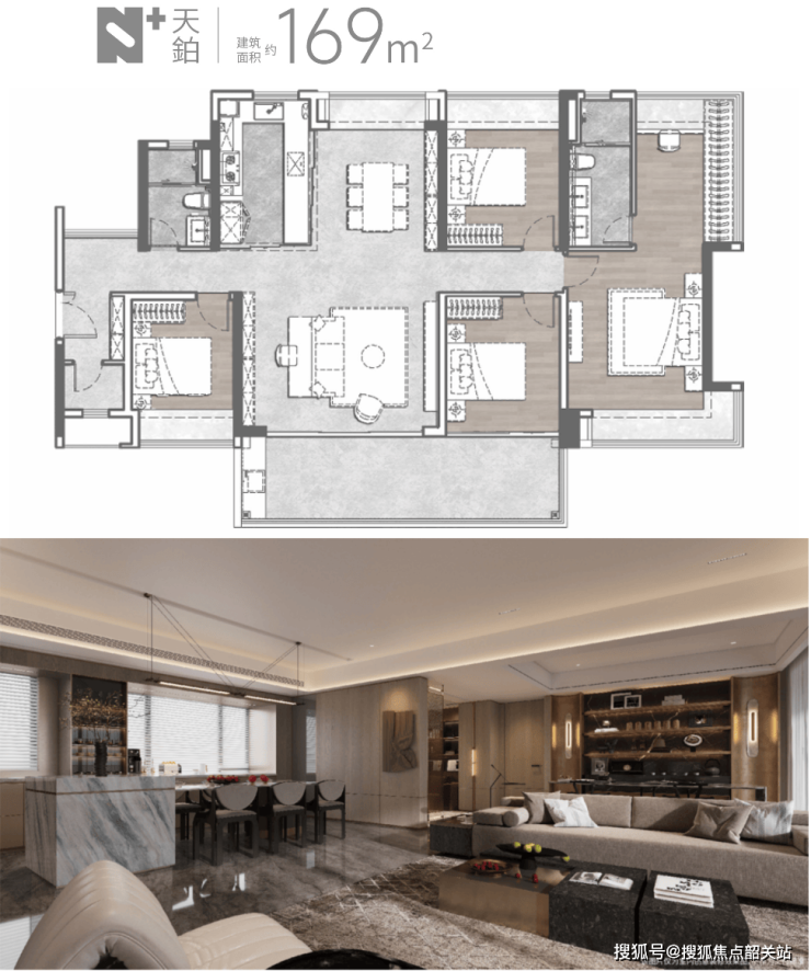169㎡四房两厅三卫:终极豪宅,同样注重细节设计,精研都会理想人居的空间细节,为业主臻享惬意的品质生活。入户花园,主套带衣帽间,港科大校园景观。四开间朝南,6.3m宽景大阳台。IMAX巨幕会客聚厅,5面宽布局,全家生活聚合场。南北通透双阳台设计,瞰景阳台约6米+。五开间朝南,约18m采光,阳光流连。