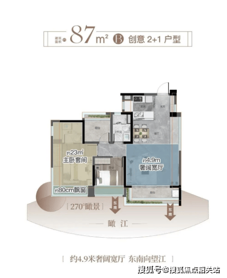87B户型:宽幕客厅设计,近110%使用空间,酒店套房式主卧,居境升级。