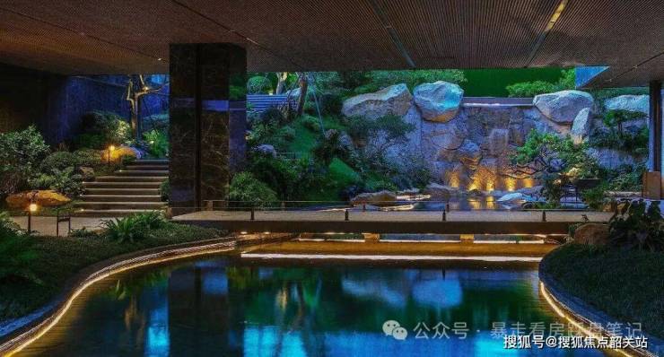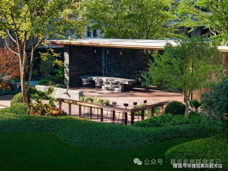 ——林荫景观会客厅沿用榕樾生活馆的爱马仕灰石材、香槟金铝板等经典元素,搭配灵动水景与原株移植斜飘紫花风铃木,呈现一处惬意的休闲空间。