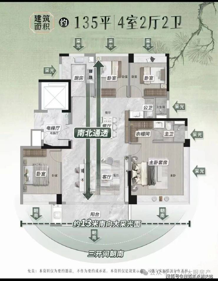 约 135㎡的 4 室 2 厅 2 卫户型,拥有约 13 米南向大采光面,三开间朝南,让室内阳光充足。