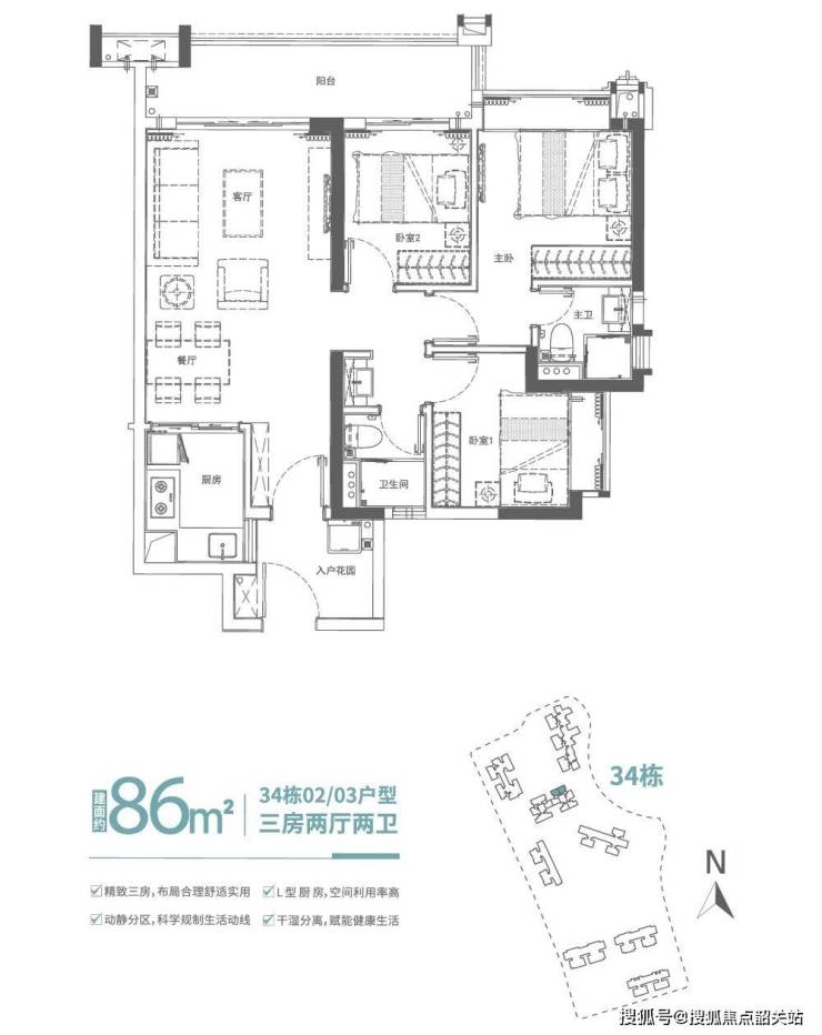 建面约82㎡三房户型,定位刚需三房,户型紧凑实用,空间利用率高,适配刚需家庭。该户型格局方正,南北通透,采光通风俱佳;客厅连通阳台,延伸空间视野,让自然光线充分涌入;三房设计,可灵活改造为儿童房、书房或客房,满足家庭不同阶段的需求;厨房采用L型布局,操作动线合理,预留充足的储物空间,适配日常烹饪需求;卫生间干湿分离,提升使用便捷度与整洁度,性价比拉满。
