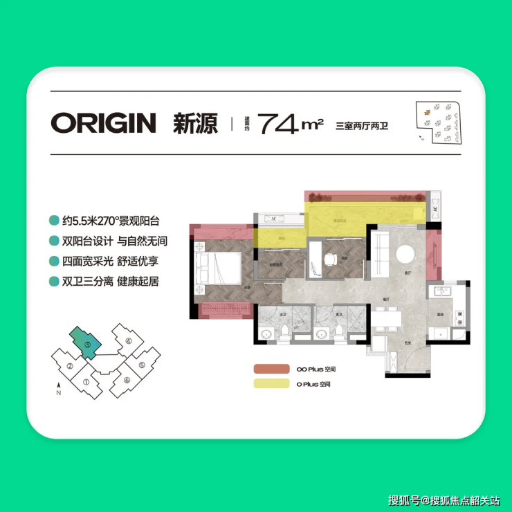 约76㎡3房2厅真2卫:与74㎡户型形成互补,同样延续高实用率核心优势。约5.5米大阳台搭配270°视野,将自然景观与阳光引入室内,打造开阔的居住视野。四开间采光、三房真两卫设计,满足家庭日常居住的核心需求,无论是刚需自住还是过渡置业,都是优质选择。