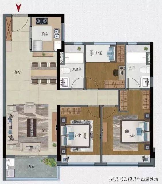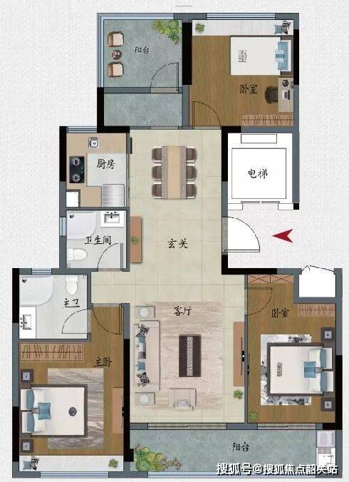 119㎡3+1房两厅两卫(新加推):专梯专户,南北对流,南向双阳台+北向多功能阳台,实用率出众;