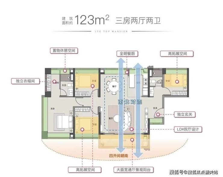 123㎡四房,大方厅+开放式厨房,三面采光+飘窗,主卧超豪华,三面采光,带超大衣帽间。