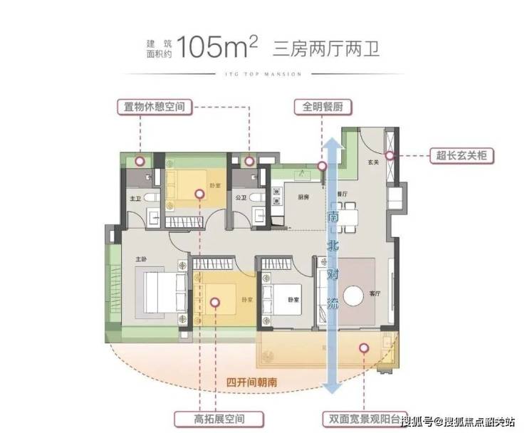 105㎡做四房,玄关、南向卧室、阳台等布局和85㎡相似,不同的是,北向一卧室夹在两卫中间。