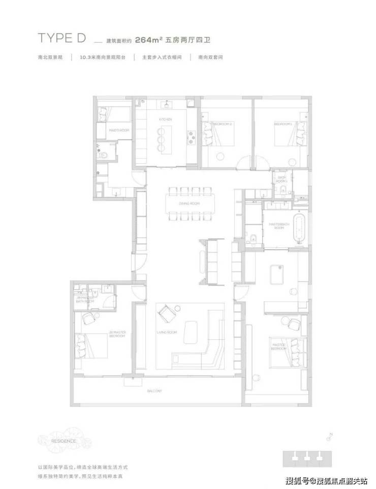 264㎡五房两厅四卫:超奢华四件套南向主卧,标准南向次主卧,6.6米巨型方厅,纵向超长LDK一体化空间,专属家政保姆空间,超大容量收纳空间。