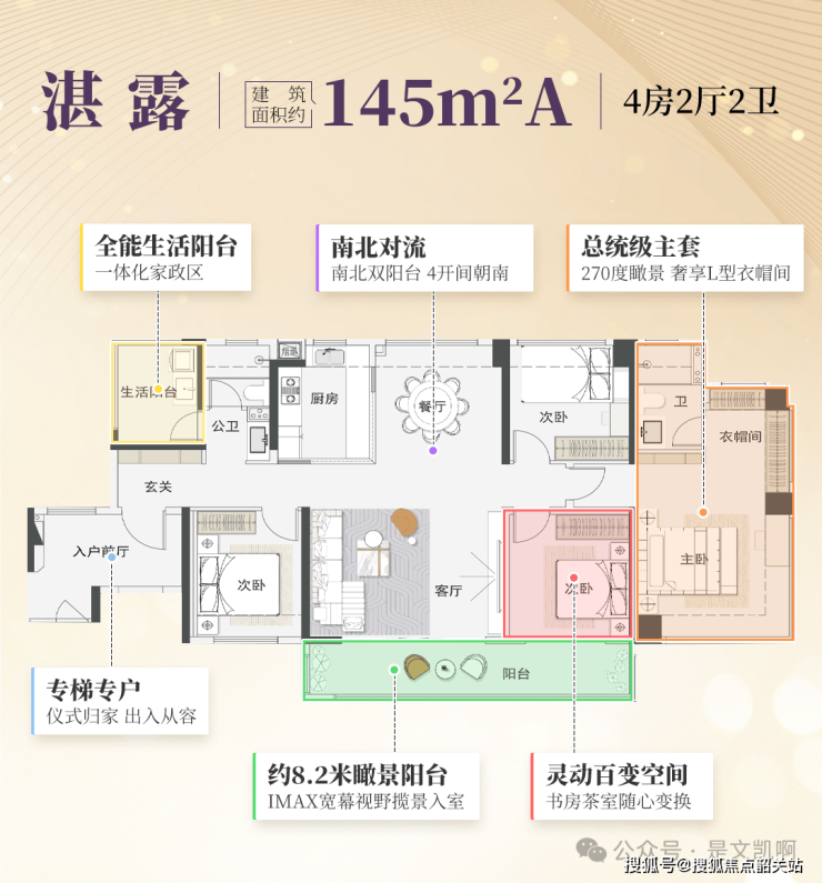 宽景格局:主打四开间朝南、南北通透,标配7-8.7米超大景观阳台,采光通风极佳。