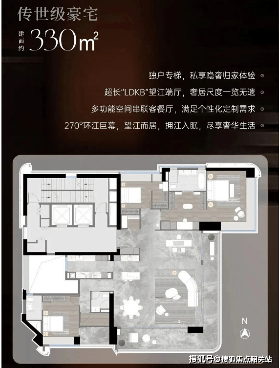 咱们来聊聊硬核的产品力。琶洲樾华樾的户型,只有三个面积段:248㎡、253㎡和330㎡。注意,最小都是248平,这直接把门槛拉到了天际。这种设计思路很明确:拒绝刚需,拒绝改善,只做终极置业。梯户比是2梯2户或者2梯1户,什么意思?就是几乎可以做到专梯专户,电梯门一开,就是你家的私家玄关,隐私感爆棚。