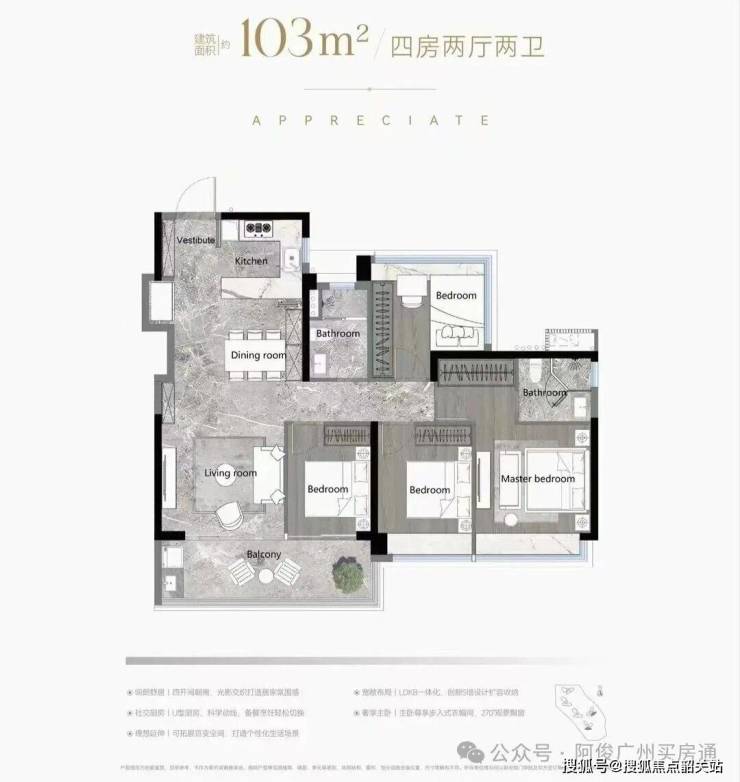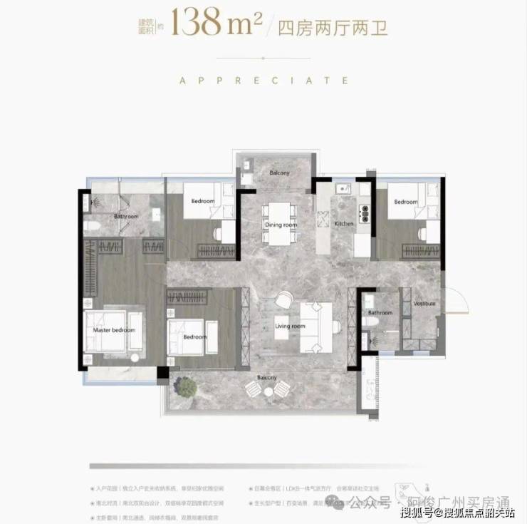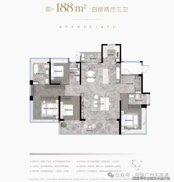在户型设计上,越秀万博和臻精益求精,融入多项人性化细节,打造舒适、实用的居住空间。多数户型采用 LDKB 一体化设计,将客厅、餐厅、厨房、阳台打通,形成超大尺度的公共活动空间,不仅提升了空间的通透感与采光性,更增强了家人之间的互动与交流;部分户型搭配约 8.65 米阔景阳台,主卧配备 270 度 L 型南向飘窗与步入式衣帽间,营造出奢阔的居住体验与尊崇感。同时,户型均做到动静分区、干湿分离,保障居住的私密性与舒适度,细节之处尽显匠心。