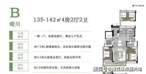 项目户型体系以120㎡以上四房大平层为主,强调南向采光、功能独立性以及通风对流性能。部分户型配置宽幕阳台或面向湿地方向的景观露台,使室内外视觉联系更为通透。户型整体方正,动静分区、干湿分离功能明确,适用于中高净值改善型家庭的多场景需求。