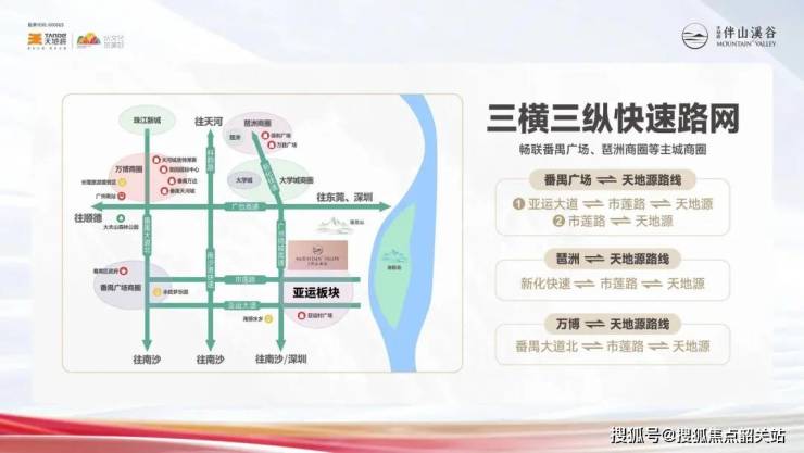 周边构建了“三纵三横”的立体交通网络,“三纵”包括番禺大道-华南快速、广州绕城高速-新化快速以及南沙港快速;“三横”则有亚运大道、市莲路和广明高速。从项目出发,驾车仅需15分钟即可到达番禺广场,20分钟抵达大学城,25分钟直抵琶洲CBD等中心区域。