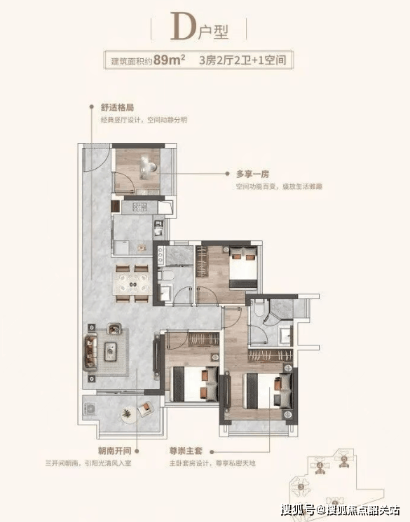 89㎡四房两厅两卫:经典竖厅布局,动静分区;三开间朝南,阳光清风常驻;主卧套房再升级;