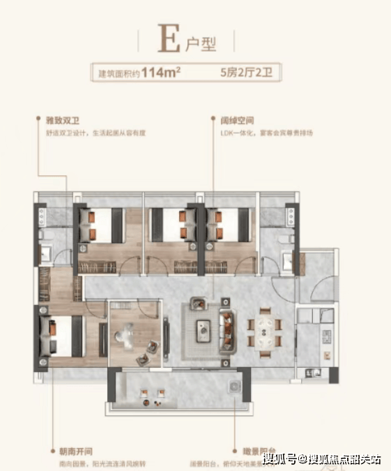 114㎡五房两厅两卫:LDK一体化设计,宴客从容大气;四开间朝南,巨幕阳台揽景入室;双卫配置,起居更高效。