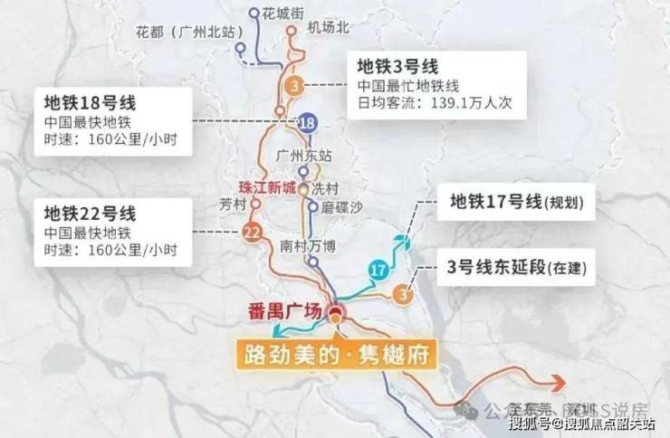 项目距离地铁番禺广场站约 900 米距离,囊括已开通的广州地铁3号线、18 号线、22 号线,3号线东延段,未来规划有广州地铁 17 号线,5 轨汇聚于此,如此便捷的交通路网是其他板块难以比拟。