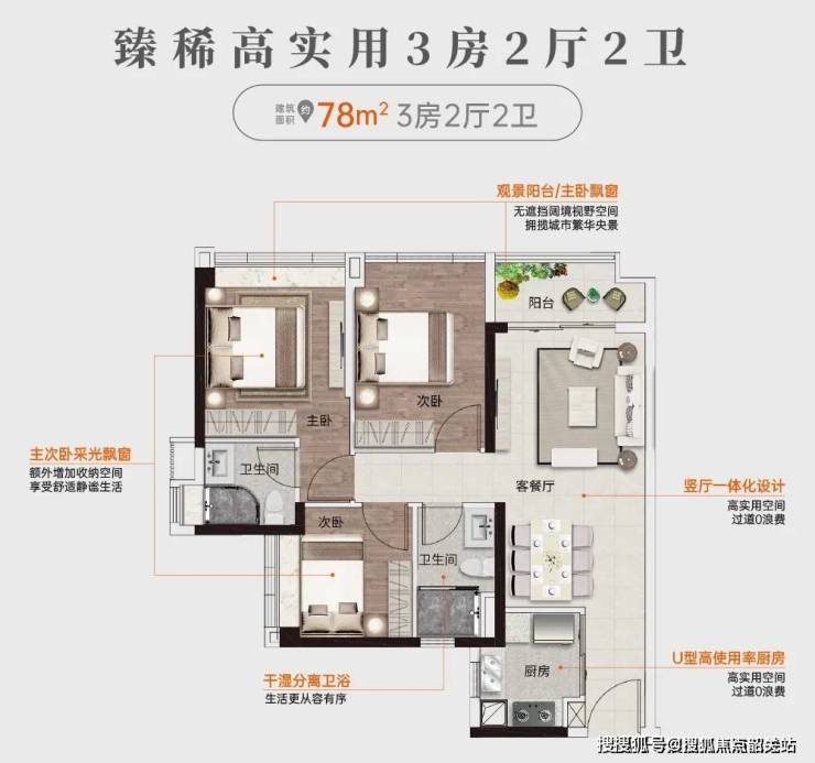 约78㎡做真三房设计,是白云市场同等面积段里少见的方正三居。户型功能性齐全、实用率高,满足购房时对生活的美好畅想。
