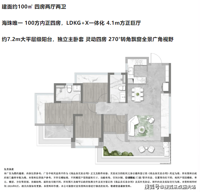 100㎡四房:区域内少有的 100㎡内正四房,4.1 米方正客厅连接 7.2 米大阳台,适合多孩家庭。