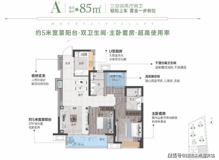 85㎡ 三房两厅两卫: 南向三房带主套设计,配有约5米宽大阳台,U型大厨房,主卧落地凸窗设计,增加采光面积。