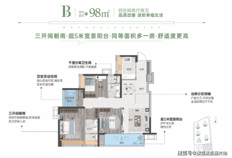98㎡ 四房两厅两卫: 区域内唯一97㎡四房户型,户户朝南,约5米宽大阳台,通风采光更佳,超15㎡奢阔主卧套房。